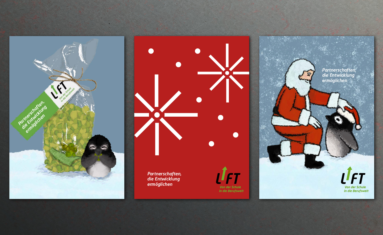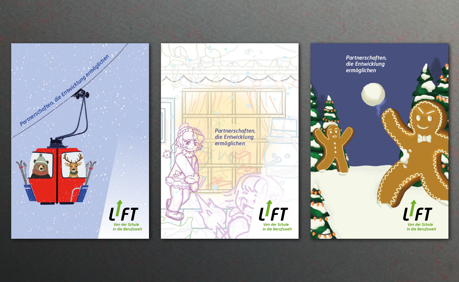 Gestaltung einer Weihnachtskarte Grösse A5, Klappkarte. Mit geliefertem Slogan und kurzen Text. Die Jugendlichen aus dem GP Grafik haben in kürzester Zeit eine grosse Auswahl an Vorschlägen ausgearbeitet.